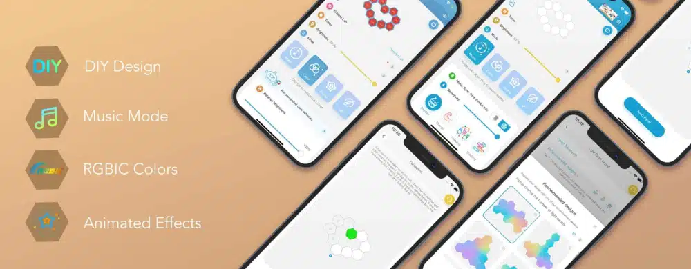 Modulinės RGBIC heksagonų plokštės leidžia susikurti unikalius raštus ir dinamiškus daugiapalvius efektus ant sienos. Valdymas per Govee Home programėlę (2.4 GHz Wi-Fi + Bluetooth), balsu (Alexa / Google), taip pat iš valdiklio dėžutės. Komplekte – 10 plokščių, klijavimo pagrindai, sujungimo laidai bei maitinimo adapteris. Plokštės skirtos vidaus naudojimui.
