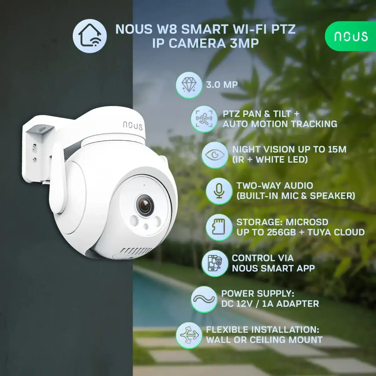 Saugokite namus ar verslą su Nous W8 – išmaniąja lauko Wi-Fi PTZ kamera, filmuojančia ryškiu 3 MP (1296p) vaizdu ir sklandžiu nuotoliniu valdymu. Veikia su Tuya ir NOUS Smart programėle, turi automatinį judesio sekimą, aiškų dvipusį garsą ir lankstų vietinį / debesijos įrašymą 24/7 stebėsenai.