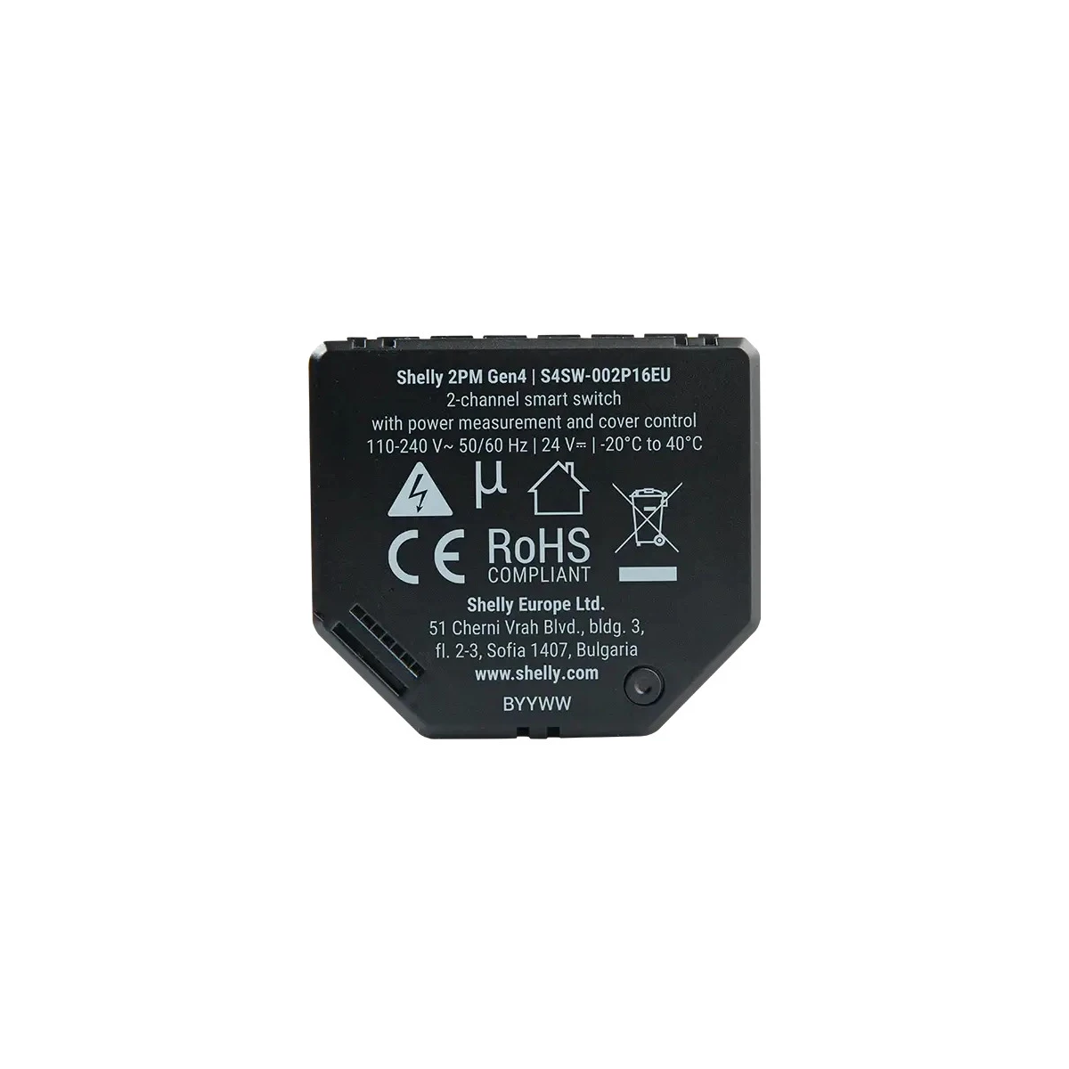 „Shelly 2PM Gen4“ yra išmanusis dviejų kanalų jungiklis su energijos matavimu ir dangtelio valdymu, leidžiantis nuotoliniu būdu valdyti dvi grandines, roletus, žaliuzes ar variklius iš bet kurios vietos. Idealiai tinka atnaujinti elektros skirstymo dėžutes, lizdus ar jungiklius net ir ankštose erdvėse.