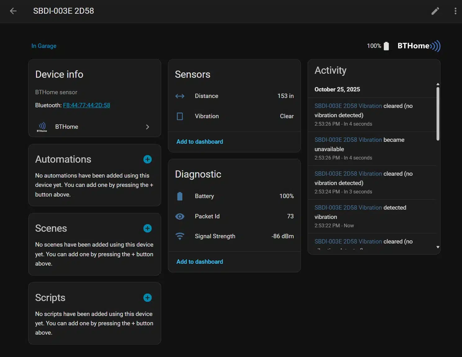 BLE („Bluetooth Low Energy“) atstumo jutiklis, matuojantis objektų/talpos lygio pokyčius ir siunčiantis būseną per BLE paketus. Tinka vandens bakams, šiukšliadėžėms, spintoms, sandėliavimo dėžėms, parkingo vietoms ar durų vartų atstumui stebėti. Veikia be debesies, o automatikas vykdo jūsų šliuzas (pvz., Shelly Plus/Pro/Gen4 su BLE) ar Home Assistant.