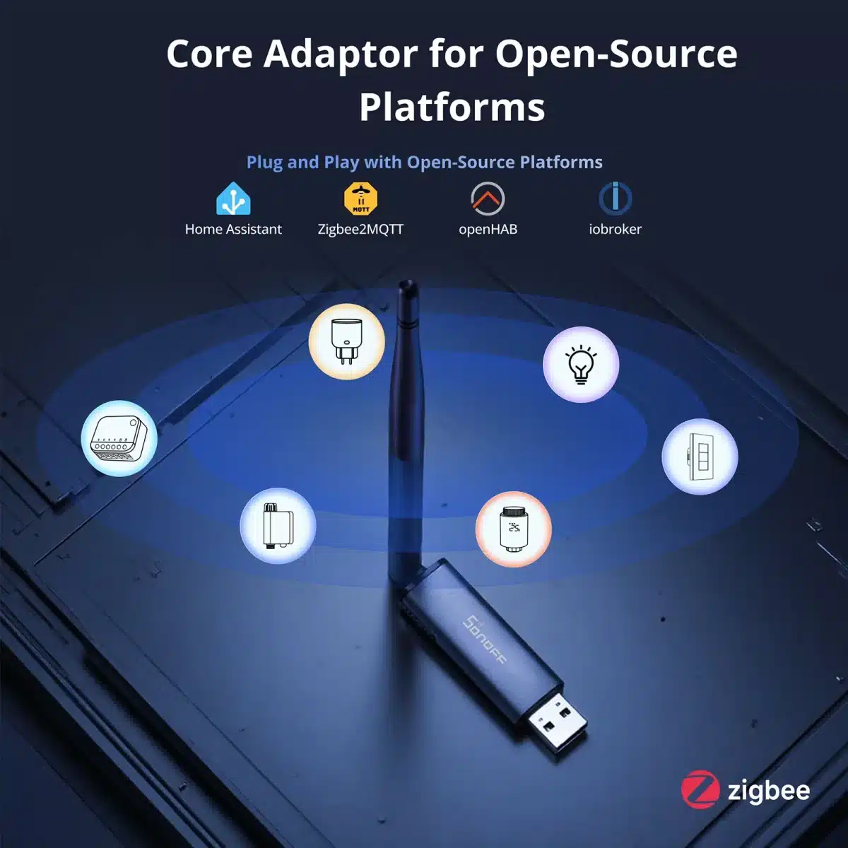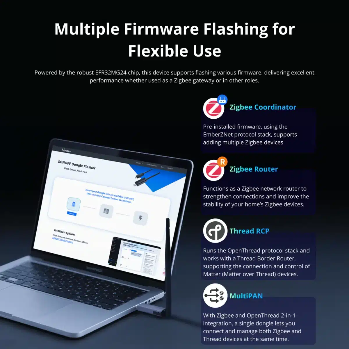 Įrenginyje iš anksto įdiegta „Zigbee“ koordinatoriaus programinė įranga, tačiau jį galima lengvai perkelti į kitas funkcijas naudojant „SONOFF Dongle Flasher“ žiniatinklio įrankį, pvz., „Zigbee“ maršrutizatorių, „OpenThread RCP“ ar net „MultiPAN“ įrenginį – visa tai per mažiau nei vieną minutę. Į komplektą įeina 1 m USB prailginimo laidas, leidžiantis lanksčiai išdėstyti įrenginį ir sumažinti trukdžius.