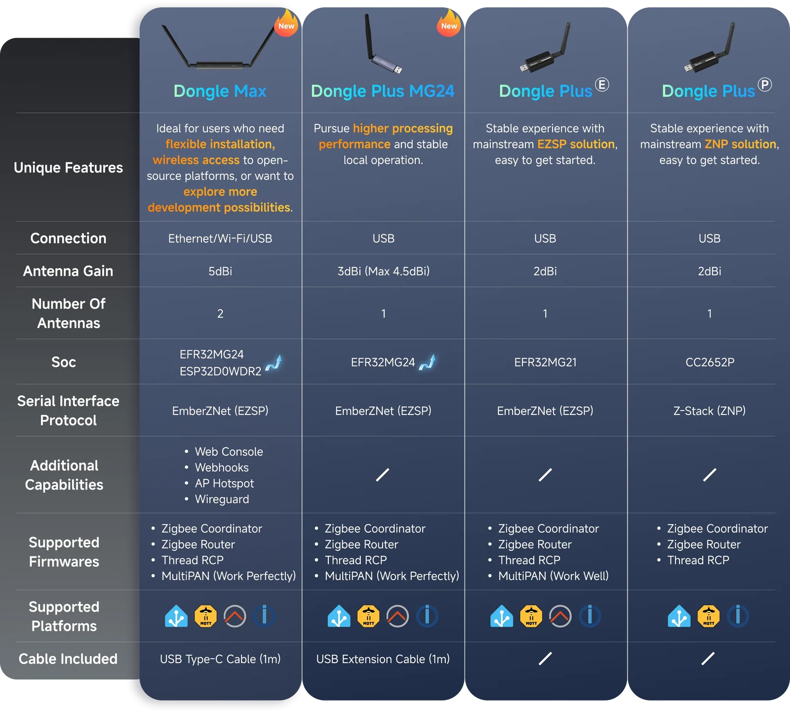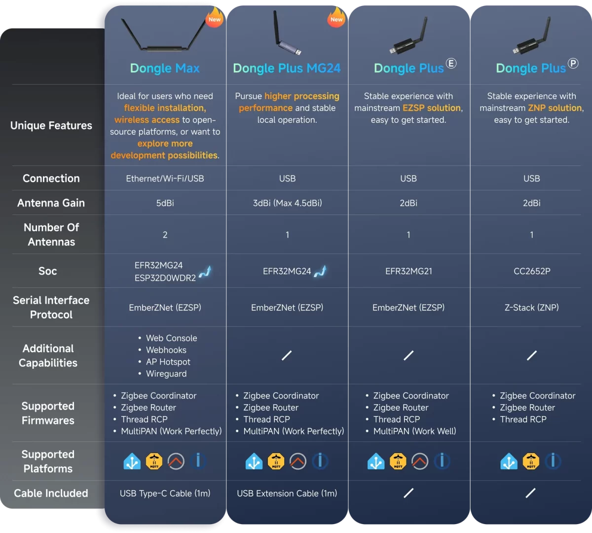 • Programinės įrangos atnaujinimas – įrenginio vaidmenų (Zigbee maršrutizatoriaus, OpenThread RCP, MultiPAN) keitimas per 1 minutę naudojant „Dongle Flasher“ žiniatinklio įrankį