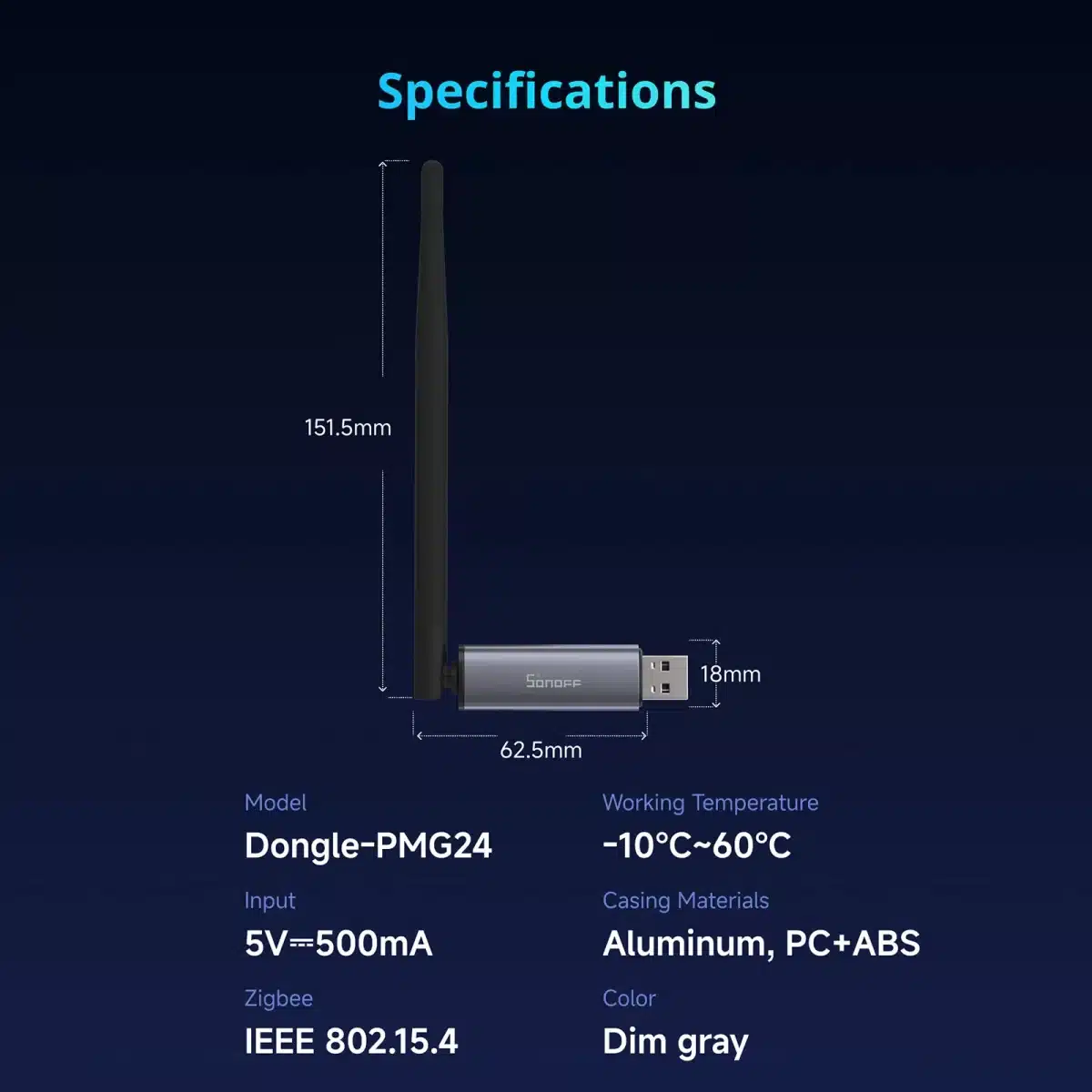 „Sonoff Dongle‑PMG24“ – oficialiai pavadintas „Zigbee/Thread USB DonglePlus MG24“ – yra vienas pažangiausių „Sonoff“ USB adapterių sprendimų, pasižymintis išskirtiniu našumu ir universalumu. Maitinamas didelio našumo EFR32MG24 SoC su 1536 KB „flash“ atmintimi ir 256 KB RAM, jis suteikia žymiai daugiau išteklių, palyginti su ankstesniais modeliais. Tai leidžia greičiau reaguoti į automatizavimą ir stabiliau valdyti papildomus įrenginius.