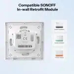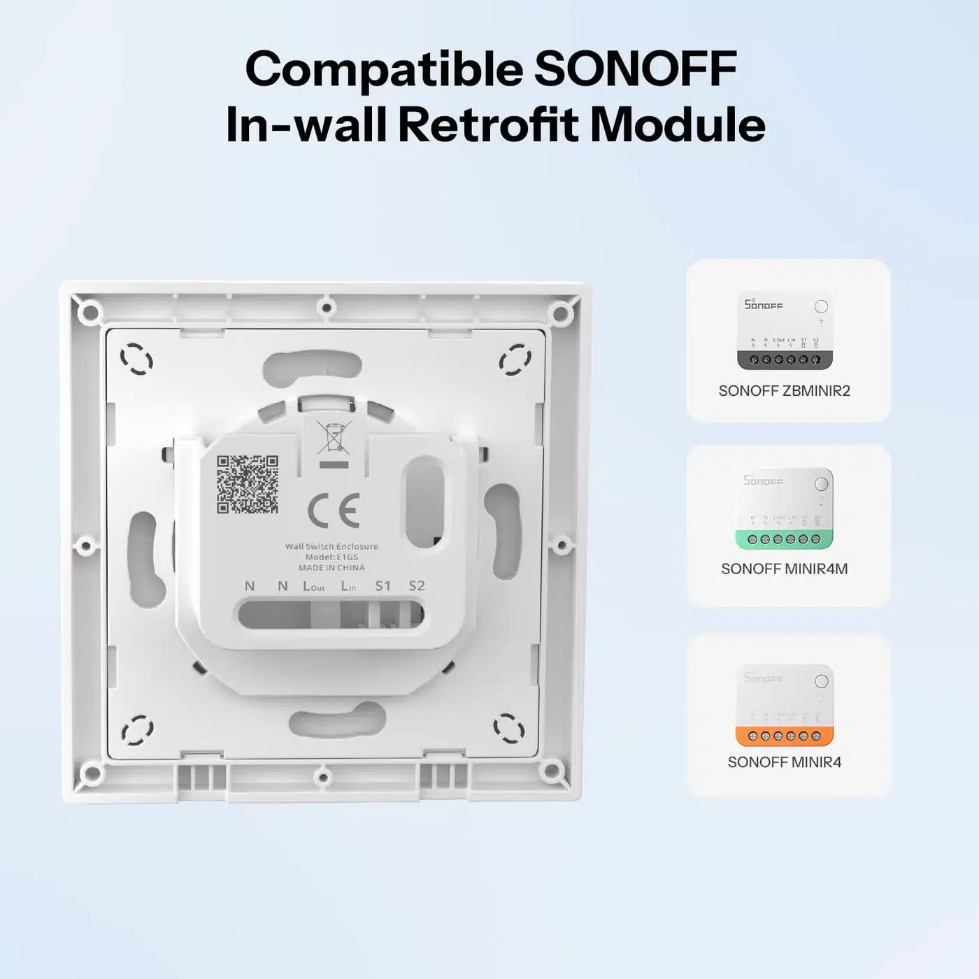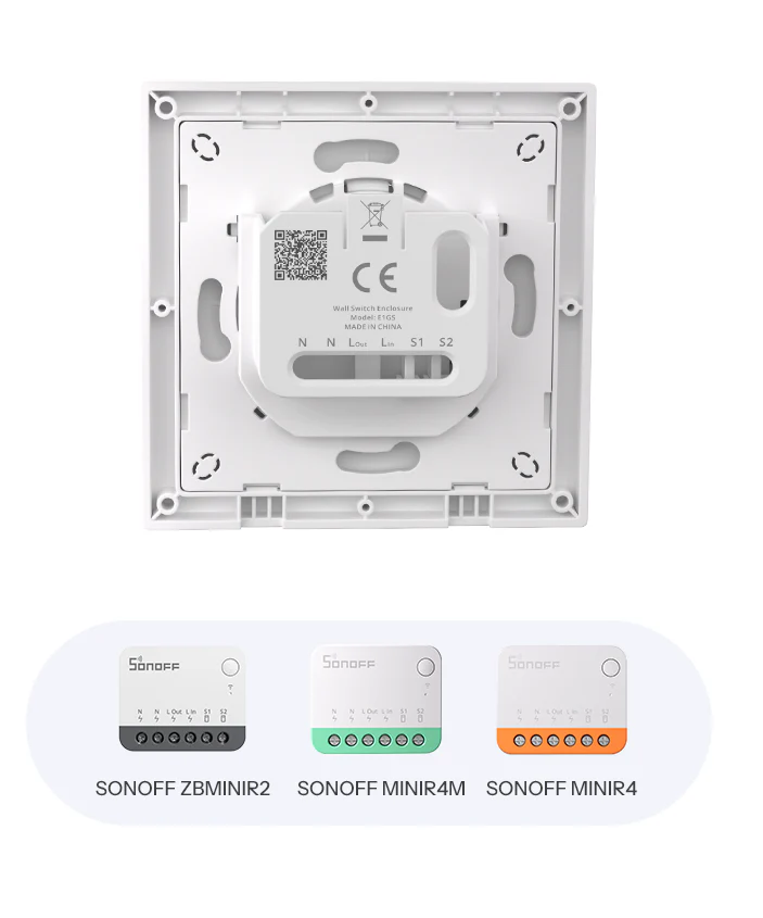„SONOFF E1GS“ yra pagalbinis jungiklis, specialiai sukurtas „SONOFF MINIR4“, „MINIR4M“ ir „ZBMINIR2“ modifikavimo moduliams, atliekantis fizinio jungiklio funkciją. Jo mini galinis dizainas ne tik užtikrina puikų suderinamumą su 86 tipo jungiamosiomis dėžutėmis ir 60 mm skersmens Europos standarto apvaliomis jungiamosiomis dėžutėmis, bet ir prisitaiko prie daugumos rinkoje esančių seklių jungiamųjų dėžučių, lengvai išspręsdamas vietos apribojimus, su kuriais dažnai susiduriama tradicinių modifikavimo modulių montavimo metu.