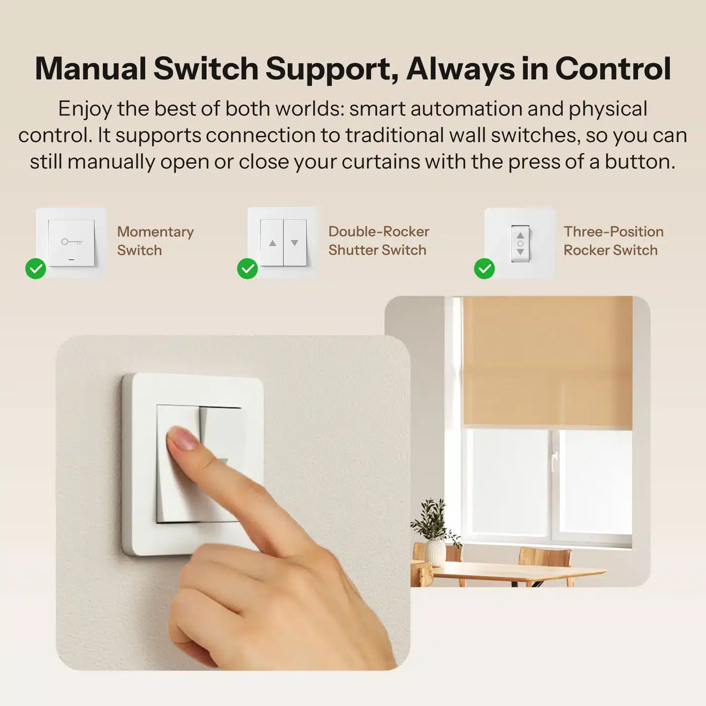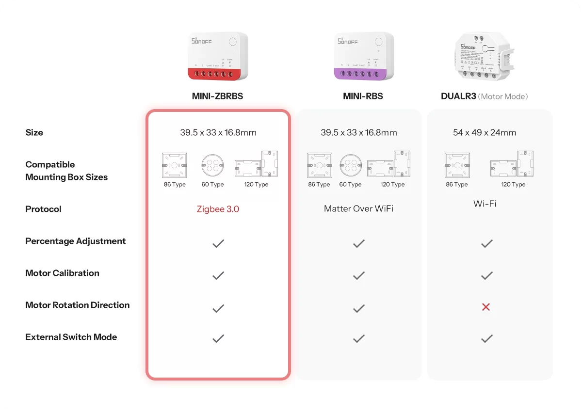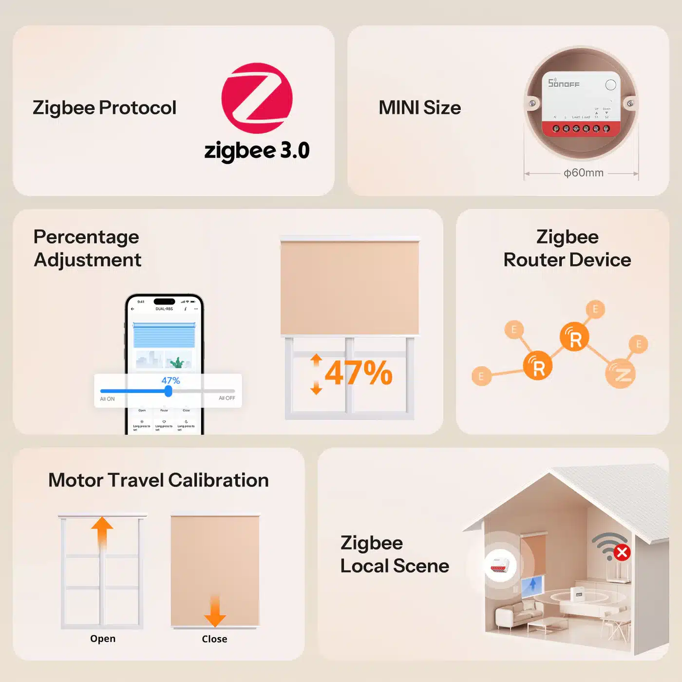 Jis palaiko variklius, kurių apkrova siekia iki 1 A, ir veikia su „Zigbee“ šakotuvu, kad būtų galima valdyti nuotoliniu būdu per programėlę, valdyti pagal grafiką ir automatizuoti scenas. Be to, jis veikia kaip „Zigbee“ signalo kartotuvas, padedantis sustiprinti ir stabilizuoti „Zigbee“ tinklo aprėptį. „MINI-ZBRBS“ pasižymi kompaktišku dizainu ir universaliomis funkcijomis, todėl tai idealus pasirinkimas išmaniajam „Zigbee“ užuolaidų valdymui.