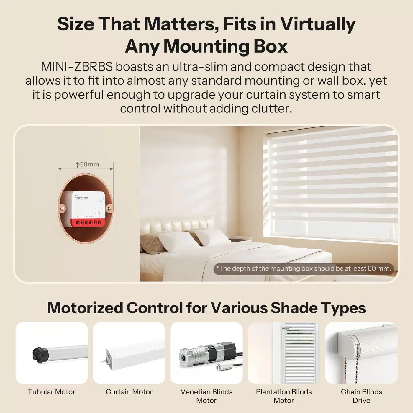 „MINI-ZBRBS“ yra kompaktiškas išmanusis „Zigbee“ užuolaidų jungiklio modulis, skirtas standartinėms sieninėms dėžutėms, leidžiantis lengvai atnaujinti tradicines motorizuotas roleto žaliuzes į išmaniąją užuolaidų sistemą.