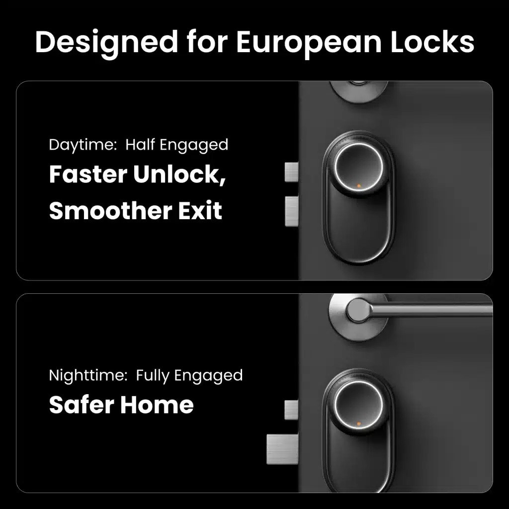 Tvirtinamas ant durų vidaus pusės (ant jūsų esamo rankenėlės/„thumb-turn“), be gręžimo – klijuojamas su 3M juosta ir laikikliu. Tinka daugumai EU (Euro) cilindrų ir kai kurioms „Scandinavian/US“ spynoms (komplekte – adapteriai).