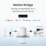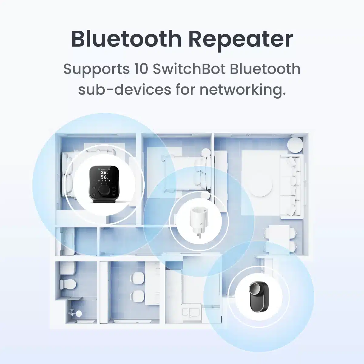 Automatizacijos su SwitchBot ekosistema: su SwitchBot Hub galima kurti tarp-įrenginių scenas (pvz., „išeinu iš namų“).