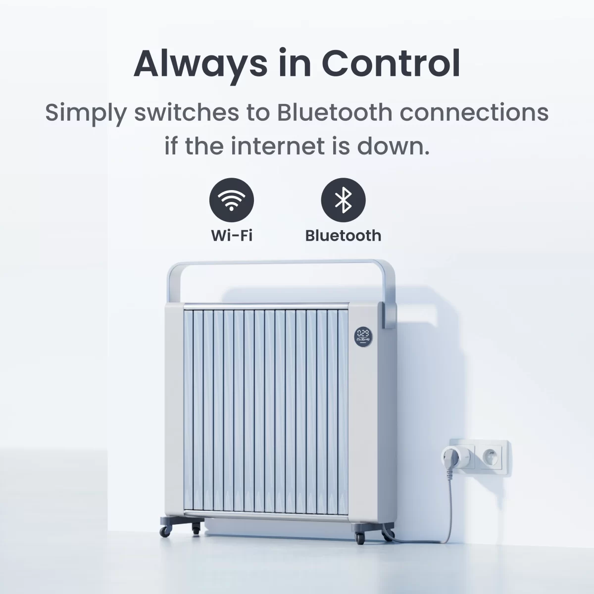 Pilnas nuotolinis valdymas: įjungimas/išjungimas, tvarkaraščiai, laikmačiai, Away/Auto režimai.