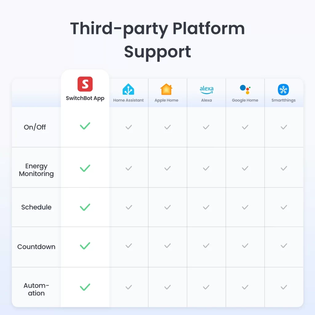 Amazon Alexa ,Apple Home Kit ,Google Home ,Home Assistant ,IFTTT ,Smart Things ,SwitchBot |