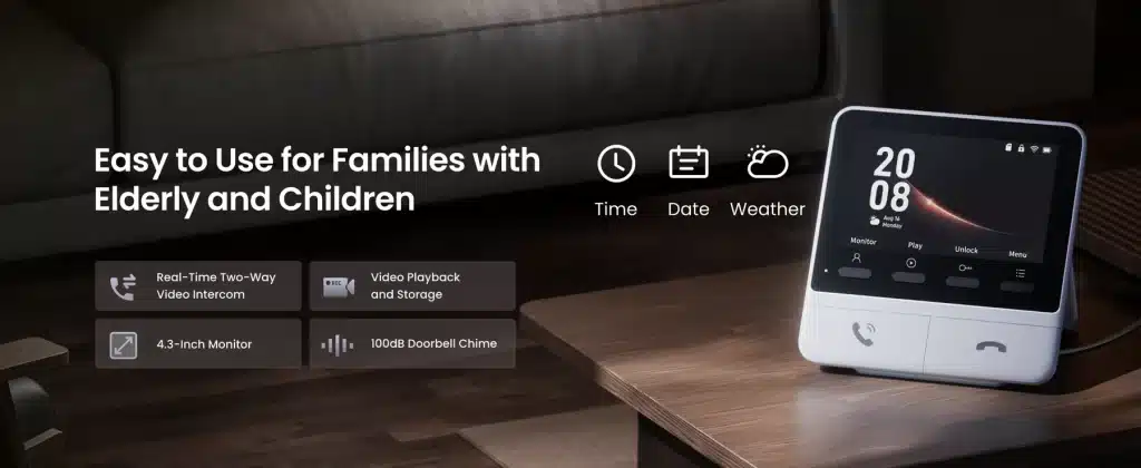 Vidaus monitorius (4,3″): akimirksniu rodo vaizdą, turi garsią skambučio funkciją ir leidžia valdyti SwitchBot spyną (Lock/Lock Ultra).